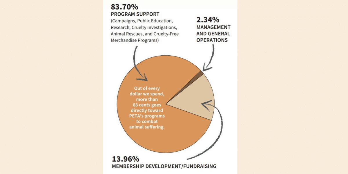 PETA is a nonprofit, tax exempt 501(c)(3) corporation funded almost exclusively by the contributions of our members. We strive to use our funds in the most cost-effective and efficient manner possible, a commitment illustrated by the fact that 83.70% of our operating expenses went directly to our programs fighting animal exploitation. We expended only 13.96% on fundraising efforts that drive our operations and 2.34% on management and general operations.
